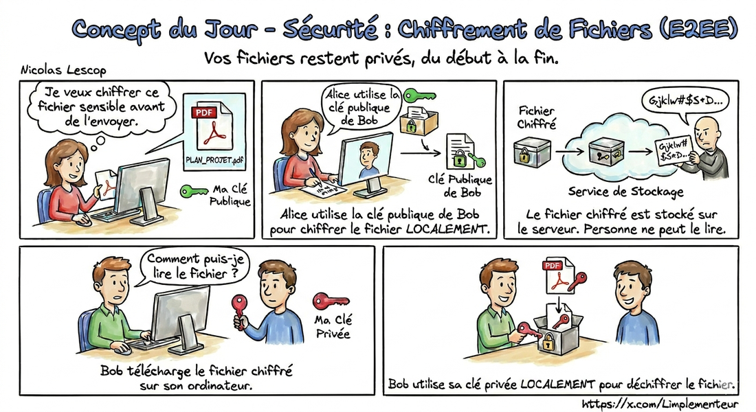 Le chiffrement de bout en bout (E2EE) offre une protection supérieure au chiffrement classique en transit (TLS) et au repos. Comprendre cette différence est essentiel pour évaluer la sécurité réelle de vos transferts.